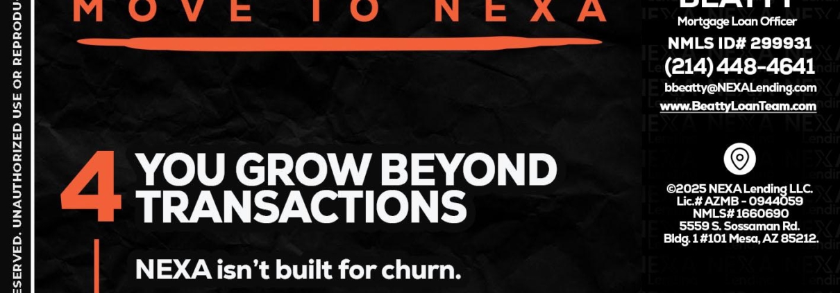 Hi, my name is Brian Beatty. I’m a Loan Officer with NEXA Lending LLC., offering personalized mortgage solutions, fast customized quotes, great rates and service with integrity.